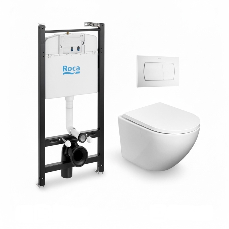 Este conjunto se compone del inodoro ROUND de 52cm marca Koller Pool en color blanco con tapa envolvente y soft close, pulsador doble blanco brillo y cisterna con bastidor oculto Roca Active. Incluye anclajes para montaje.