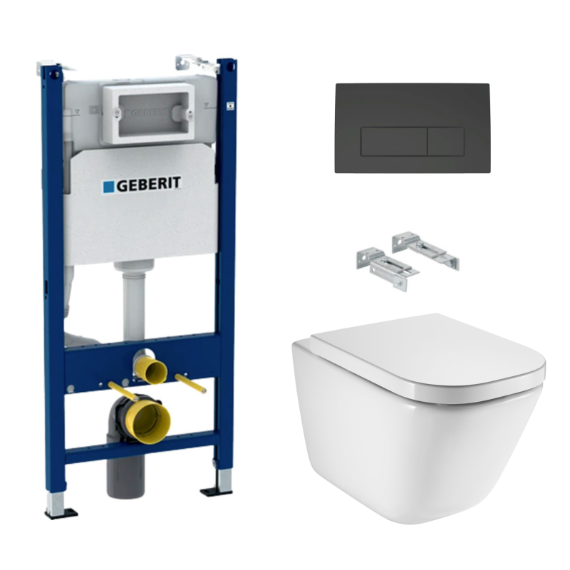 BASTIDOR GEBERIT PACK CISTERNA EMPOTRADA Y PULSADOR DELTA 50 NEGRO BR CON INODORO SUSPENDIDO ROCA THE GAP CON SISTEMA RIMLESS