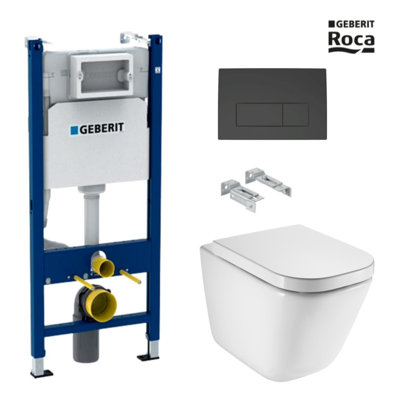 Este conjunto se compone del inodoro suspendido Roca The Gap con taza Rimless sin bridas y fijaciones invisibles + tapa y asiento Soft Close, pulsador delta 50 negro mate y cisterna con bastidor oculto Geberit.