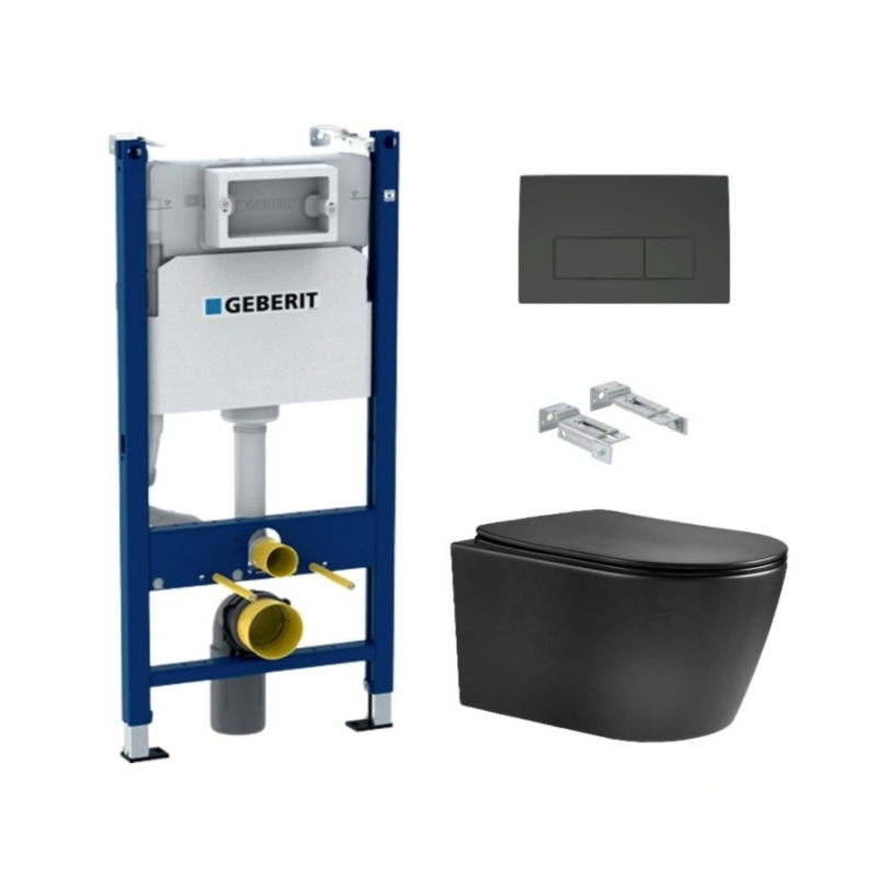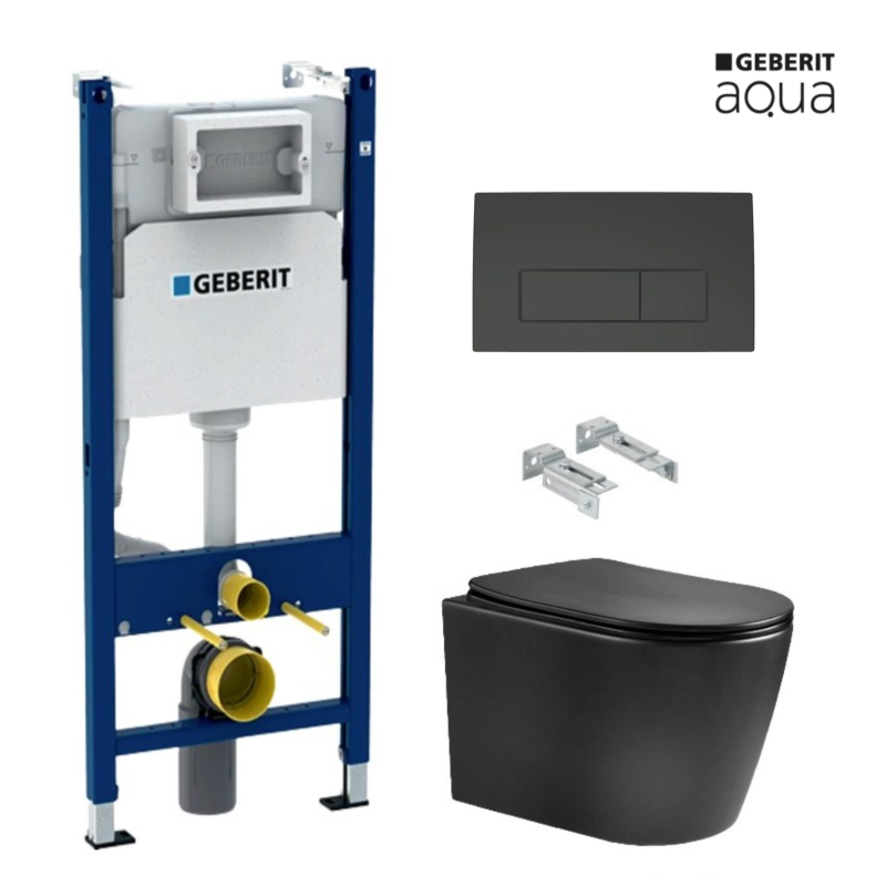 Este conjunto se compone del inodoro suspendido Nebula Black mate de 53 cm con taza Rimless + tapa y asiento Soft Close de Aqua, pulsador delta 50 negro mate y cisterna con bastidor oculto Geberit.