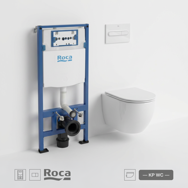 Pack wc suspendido con bastidor y cisterna Roca Duplo, pulsador PL1 blanco brillo e inodoro Koller Pool Round Pro