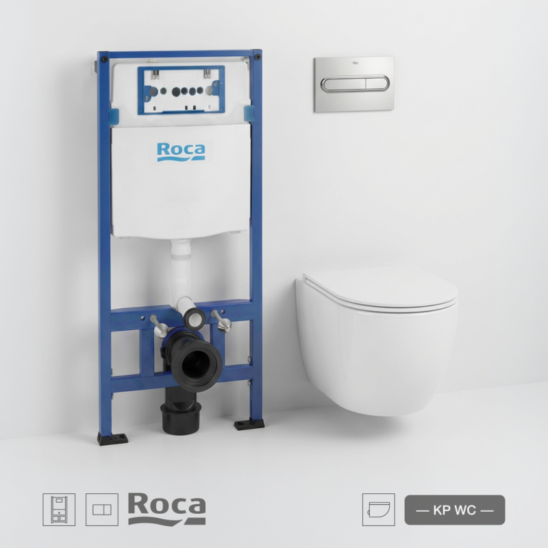 Conjunto de cisterna empotrada con bastidor Roca Duplo – Ref. A890070020, pulsador Roca PL1 Dual (ONE) Cromado Brillo – Ref. A890195001 e inodoro suspendido Koller Round Pro Total Clean marca Koller Pool de 52 cm, con asiento Soft Close y tapa fina en color blanco brillo. Incluye anclajes para su montaje.