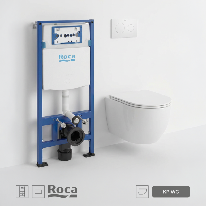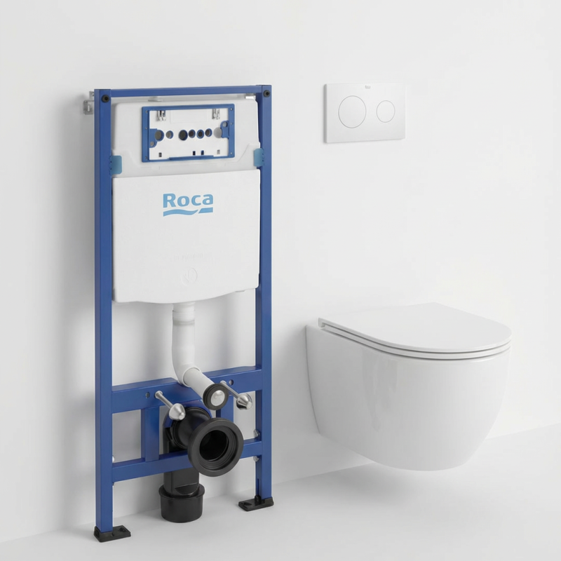 Conjunto de cisterna empotrada con bastidor Roca Duplo – Ref. A890070020, pulsador Roca PL10 Dual (ONE) Blanco Mate A890189207 e inodoro suspendido Round Pro Total Clean Tornado 3.0 marca Koller Pool de 52 cm, con asiento Soft Close y tapa envolvente en color blanco brillo. Incluye anclajes para su montaje.