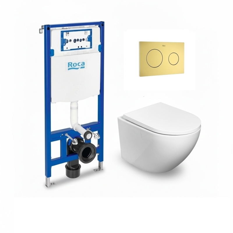 Conjunto de cisterna para empotrar y bastidor Roca Duplo, pulsador Roca PL10 DUAL ORO CEPILLADO e inodoro suspendido Round Smart Tornado 3.0 marca Koller Pool de 52cm con asiento Soft Close con tapa envolvente en color blanco brillo. Incluye anclajes para montaje.