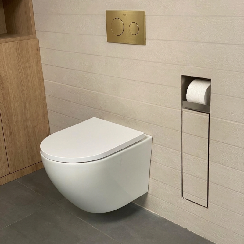 Placa de accionamiento Roca PL10 DUAL ORO CEPILLADO ONE A8901890VA con descarga dual. No es necesario la utilización de herramientas para su instalación.
