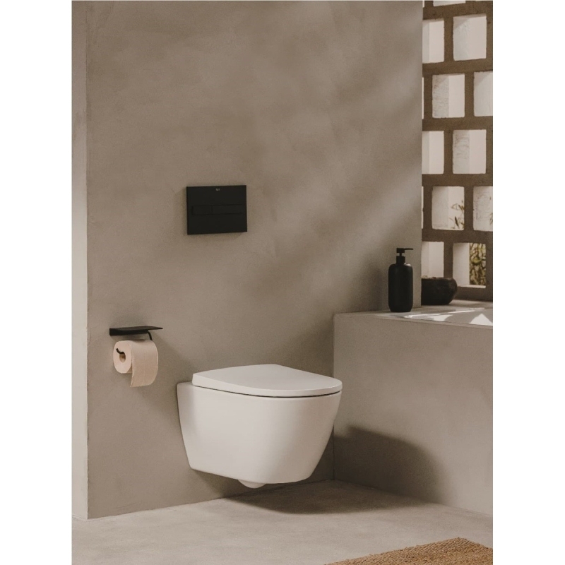 Inodoro suspendido Roca Ona sin reborde (Rimless) blanco brillo, fijaciones invisibles y asiento tapa anticaída (softclose). El material del inodoro es de porcelana sanitaria apto para espacios reducidos. Fácil de limpiar gracias al sistema sin brida.