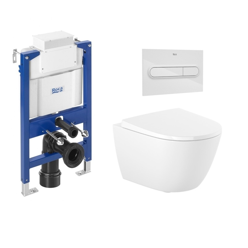 Conjunto de cisterna para empotrar y bastidor Roca Duplo BAJO VENTANA, pulsador ROCA PL1 DUAL (ONE) Blanco brillo doble descarga ahorro e inodoro ROCA ONA blanco brillo rimless con tapa anticaída.