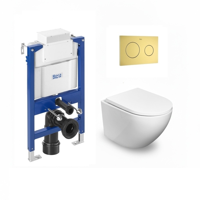 Conjunto de cisterna para empotrar y bastidor Roca Duplo BAJO VENTANA, pulsador Roca PL10 DUAL ORO CEPILLADO e inodoro suspendido Round Smart Tornado 3.0 marca Koller Pool de 52cm con asiento Soft Close con tapa envolvente en color blanco brillo. Incluye anclajes para montaje.