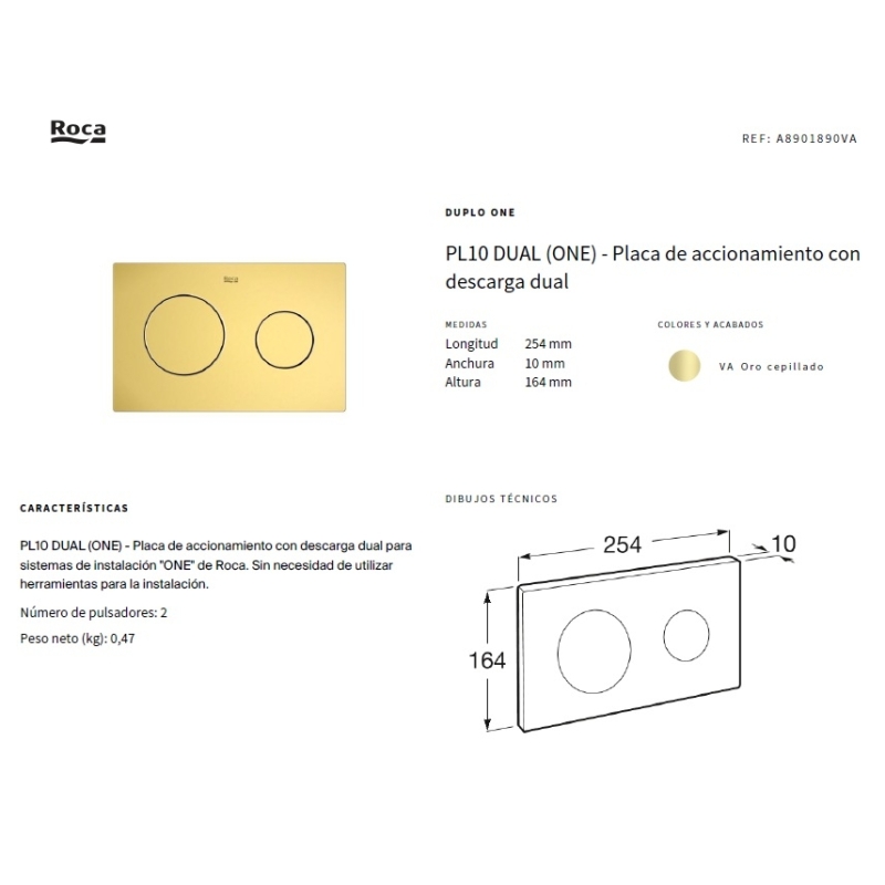 Placa de accionamiento Roca PL10 DUAL ORO CEPILLADO ONE A8901890VA con descarga dual. No es necesario la utilización de herramientas para su instalación.