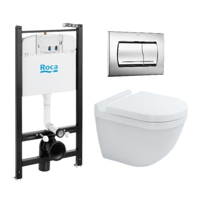 Este conjunto se compone del inodoro suspendido Starck 3 Rim-ex marca Duravit de 54cm en color blanco con tapa amortiguada, pulsador ROCA Active Cromo Brillo y cisterna con bastidor oculto ROCA Active.