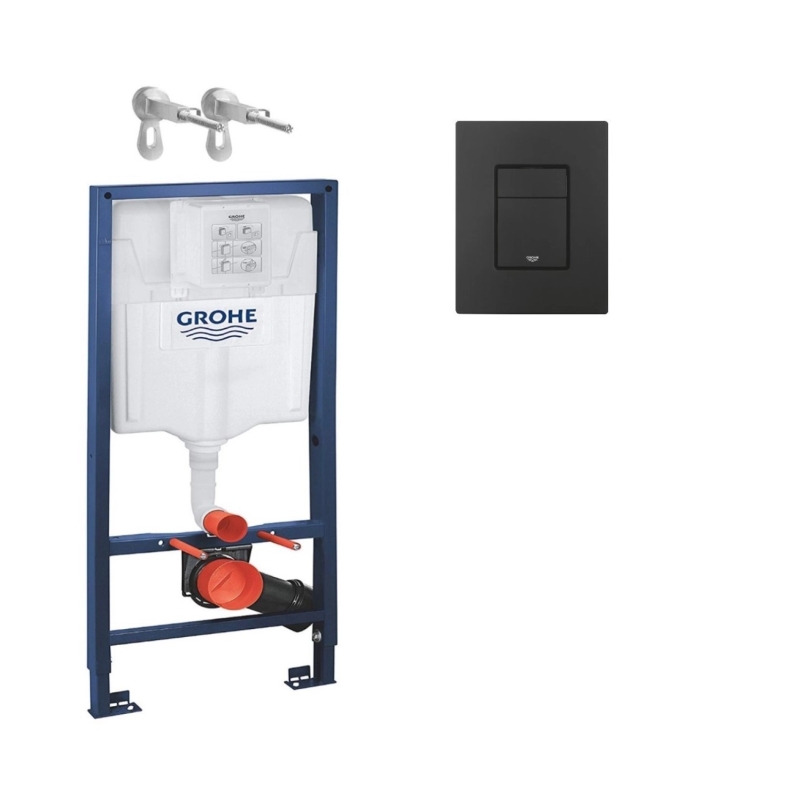 Bastidor certificado por TÜV con una capacidad de carga de 400Kg, que puede instalarse en una pared de carga o bien en una pared hueca debidamente reforzada. Incluye los tornillos de fijación a la pared ref.3855800M y el doble pulsador de descarga Even negro mate con el sistema Grohe EcoJoy, que permite un ahorro del consumo de agua de hasta un 50%, cisterna GD 2 de 3 y 6 litros.