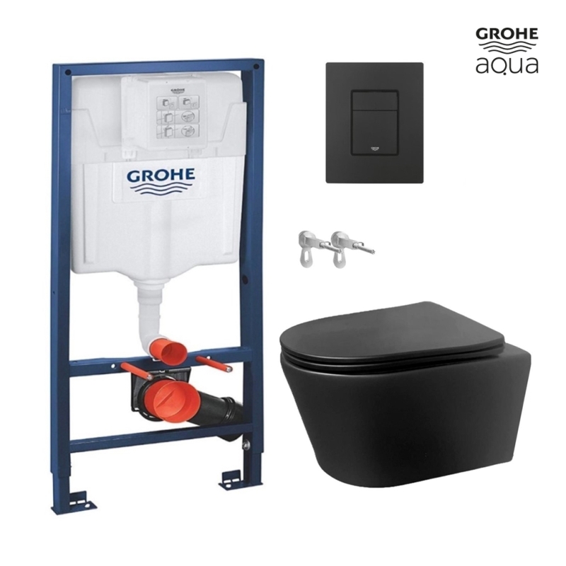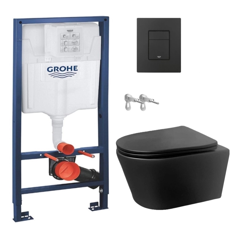 Este conjunto se compone de Inodoro Lia Negro suspendido Rimless en color negro mate, de fácil limpieza, mantenimiento e instalación rápida y el kit de Cisterna Empotrable de Grohe con bastidor y pulsador negro mate. El asiento soft close está incluido en el paquete.
