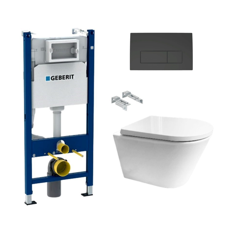 Conjunto de cisterna para empotrar y bastidor Geberit, pulsador Delta 50 negro mate e inodoro suspendido Orion suspendido Tornado 3.0 blanco mate con tapa anticaída. Incluye anclajes para montaje.
