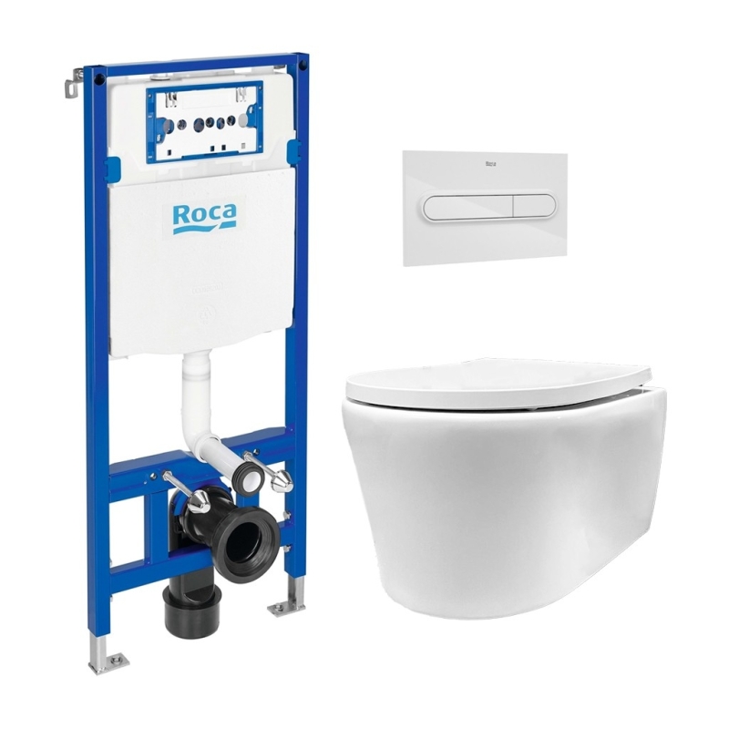 Este conjunto se compone del inodoro suspendido Lia de AQUA Rimless en color blanco brillo con tapa amortiguada, pulsador PL1 Dual Blanco brillo y cisterna con bastidor oculto Roca Duplo. Incluye anclajes para montaje.