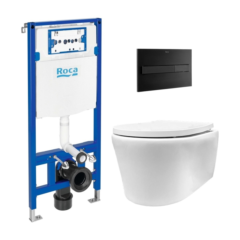 Bastidor empotrado ROCA Duplo Pack con cisterna y pulsador PL7 Dual negro mat, inodoro suspendido Tornado LIA EKOVIA AzulBath