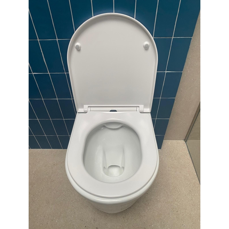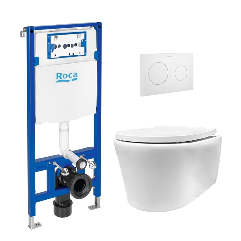 Este conjunto se compone del inodoro suspendido Lia marca AQUA Rimless en color blanco brillo con tapa amortiguada, pulsador PL10 Dual Blanco mate y cisterna con bastidor oculto Roca Duplo. Incluye anclajes para montaje.