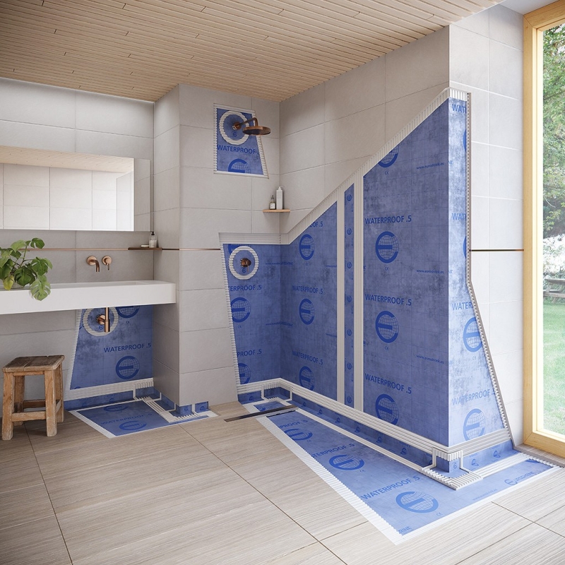 E-Waterproof.5 es una pieza especial de la lamina impermeable Waterproof.5 de Euroshrink, por las esquinas exteriores de un baño.